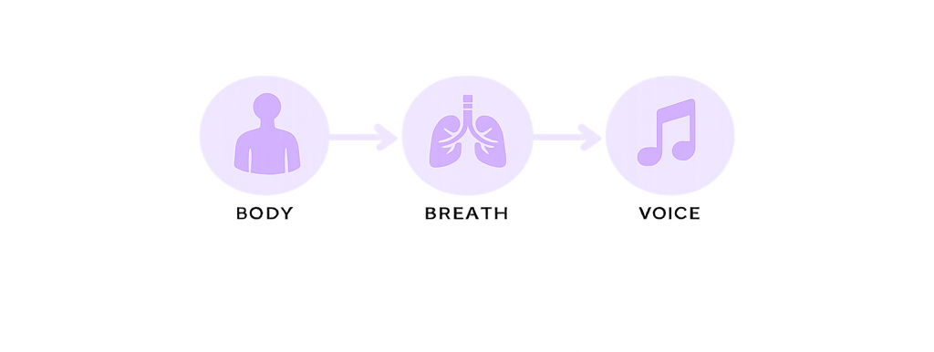 多くのボイストレーニングは「声」から入りますが、このレッスンではまず身体、次に呼吸、そして声という順番を大切にしています。